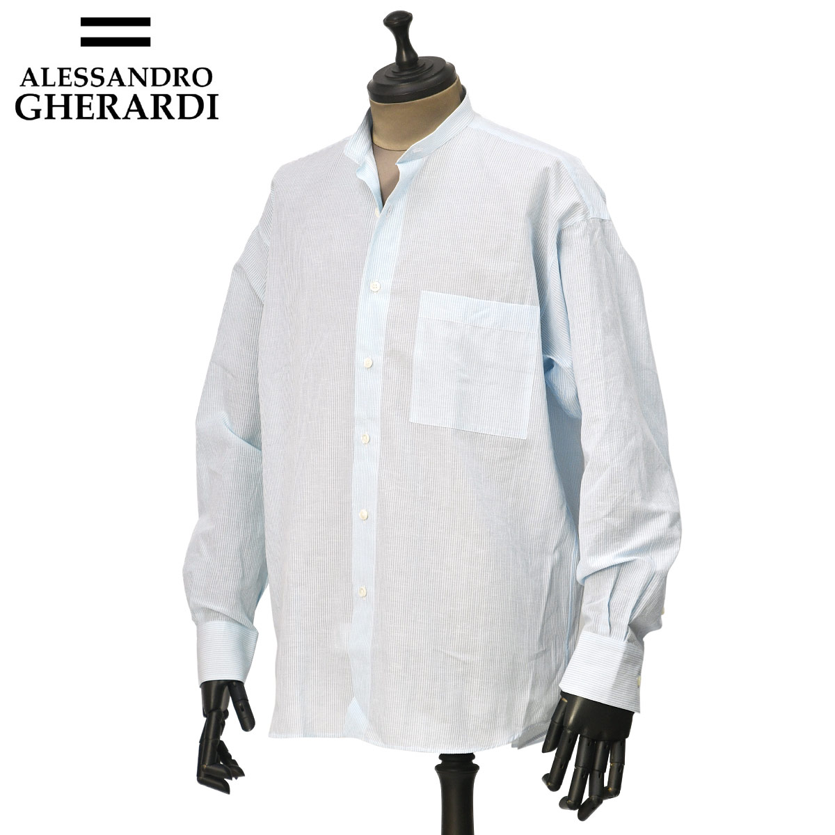 ♣ALESSANDRO GHERARDI【アレッサンドロ・ゲラルディ】バンドカラーシャツ KORI 7630 622 コットン リネン ストライプ ブルー