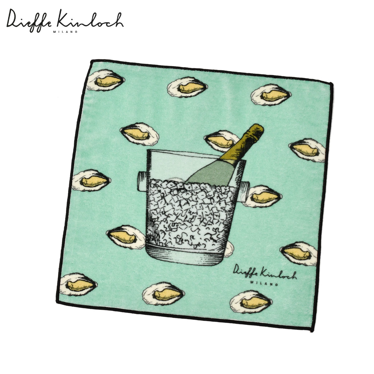 ♣Dieffe Kinloch【ディエッフェ・キンロック】プリントタオルハンカチ CHAMPAGNE and OSTRICHE コットン ターコイズ ネイビー