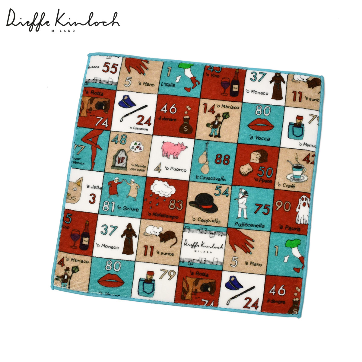 ♣Dieffe Kinloch【ディエッフェ・キンロック】プリントタオルハンカチ SMORFIA コットン マルチ ターコイズ