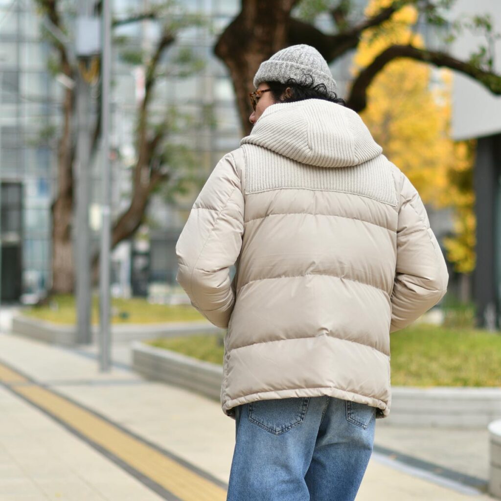 余裕感を纏えるライトベージュカラーでニットとダウンの