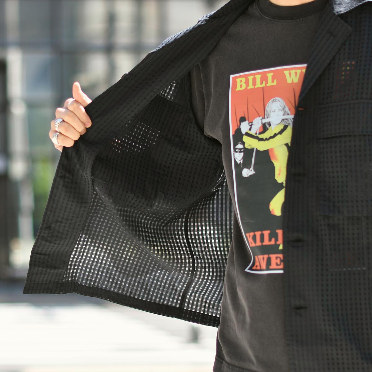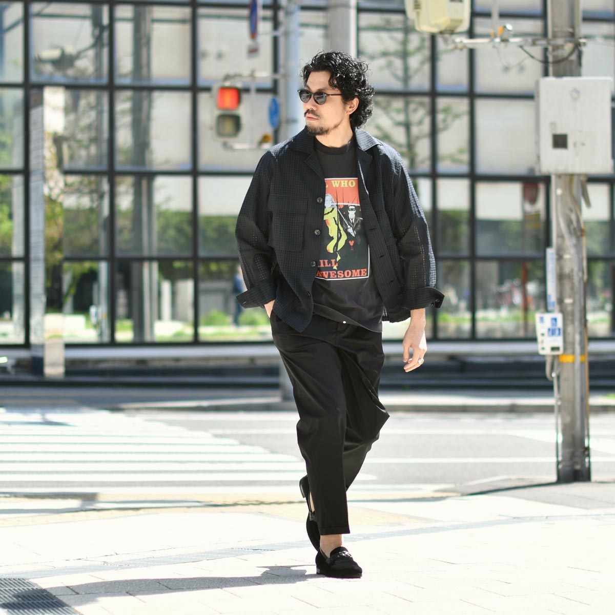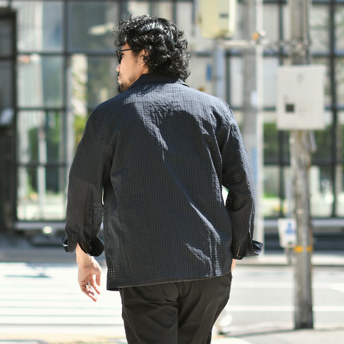 通気性のある素材で軽やかに見せています。夏でも羽織れる「抜け感」がポイントです。
