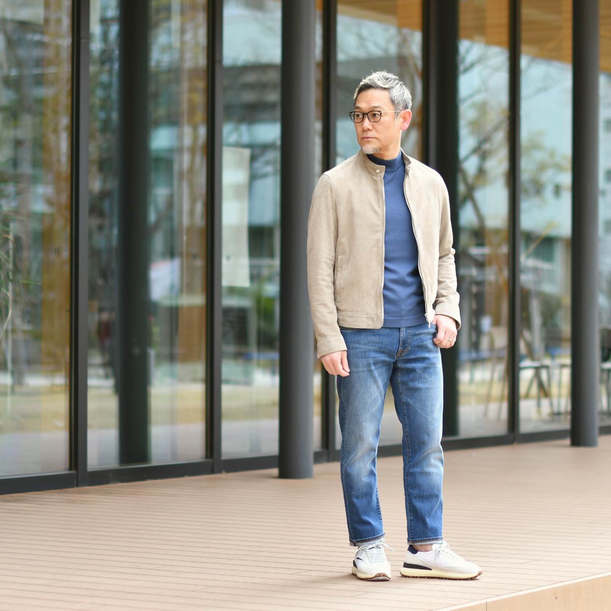 ベージュのレザーアウターとデニムパンツを合わせた