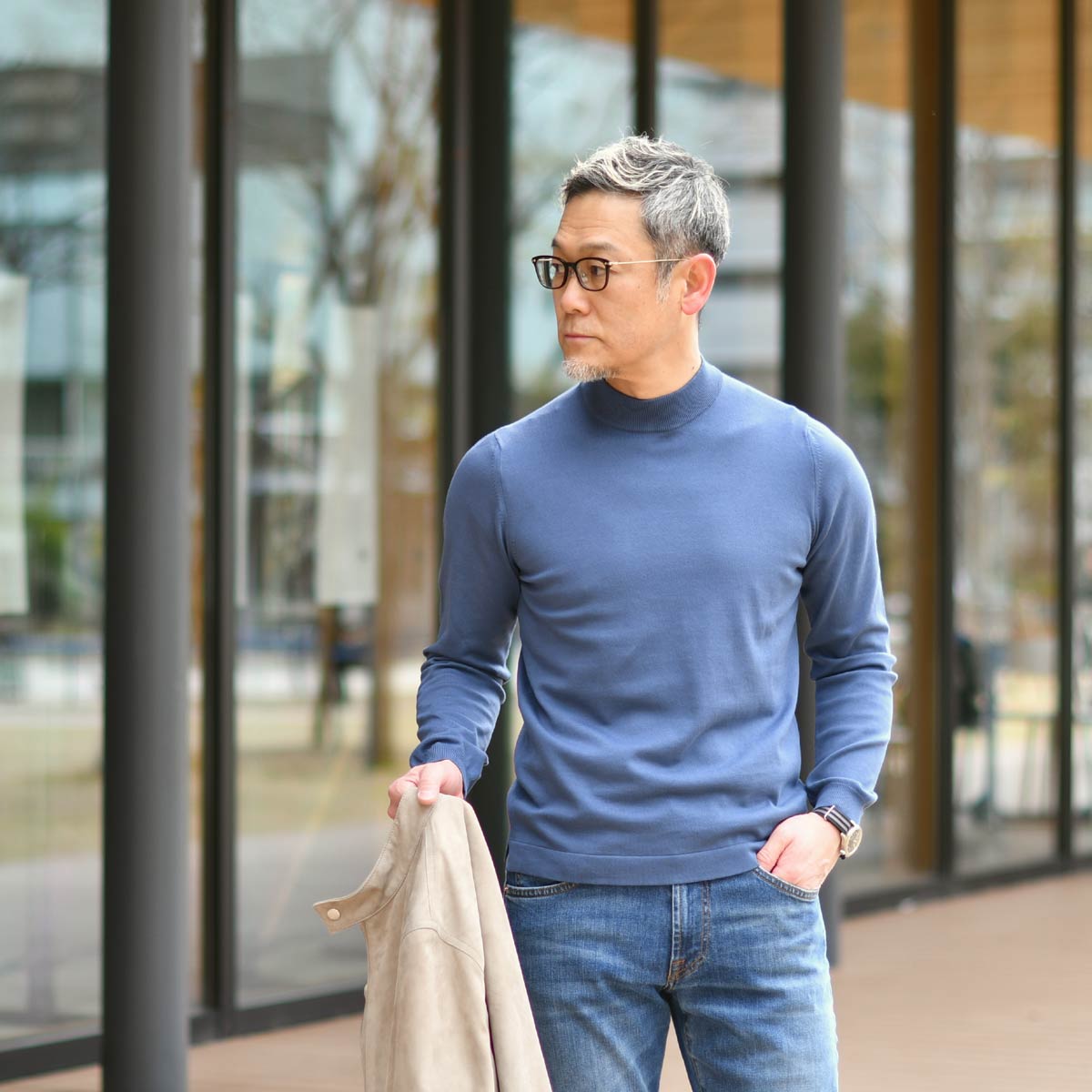 インナーには GRAN SASSO【グランサッソ】のブルーグレーのモックネック。