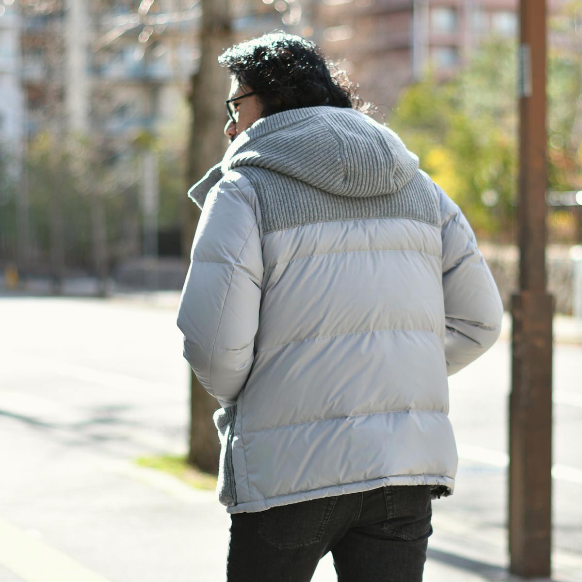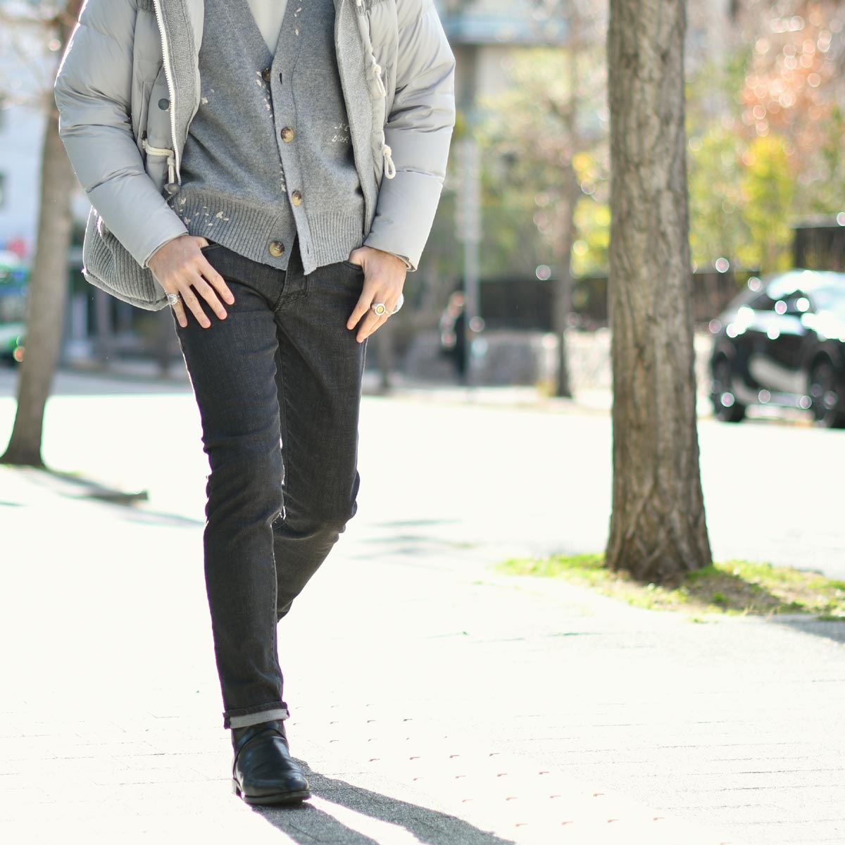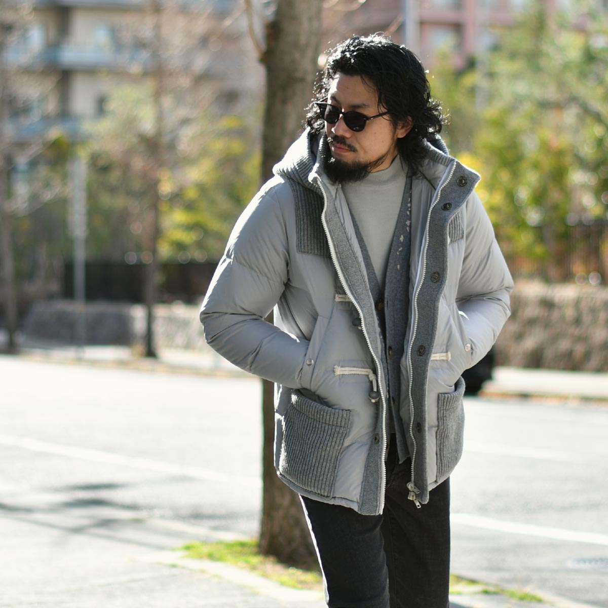 ライトグレーの明るい色味が冬の重くなりがちな着こなしに軽快さを生み出します。