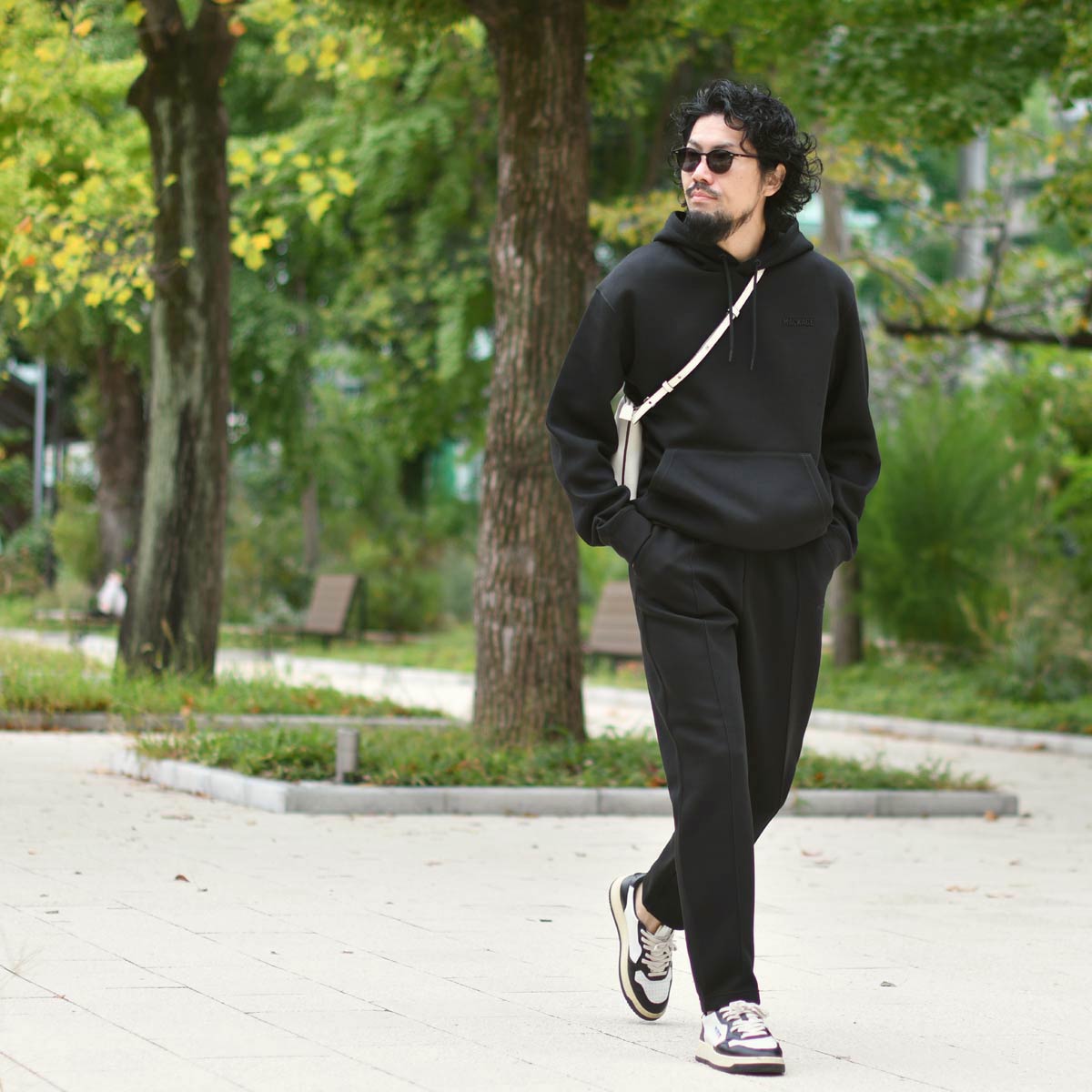 今回はフーディーと同素材のパンツのセットアップでご用意。