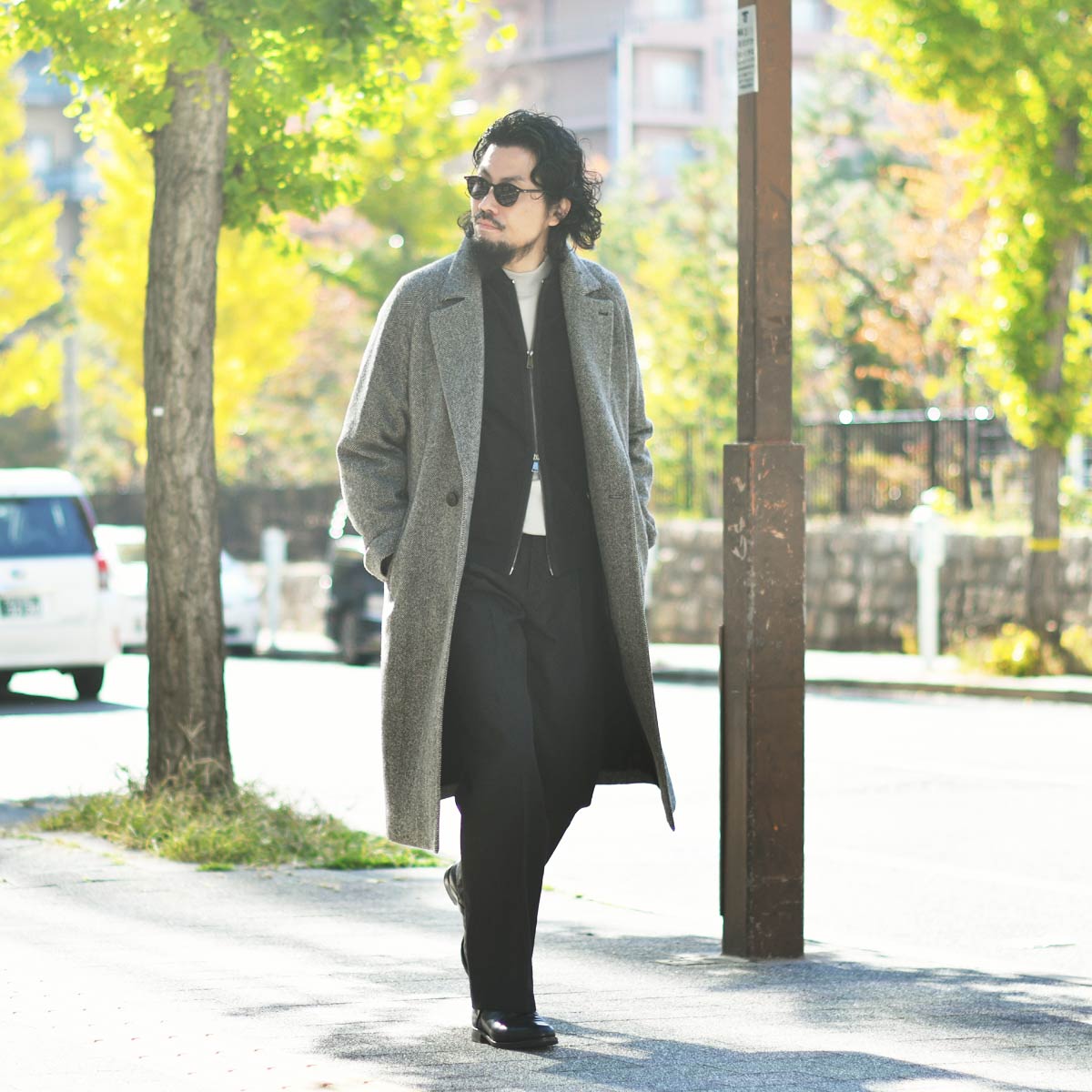 柄物コートは今回の様なカジュアルスタイルにも難なく合わせて頂けて、