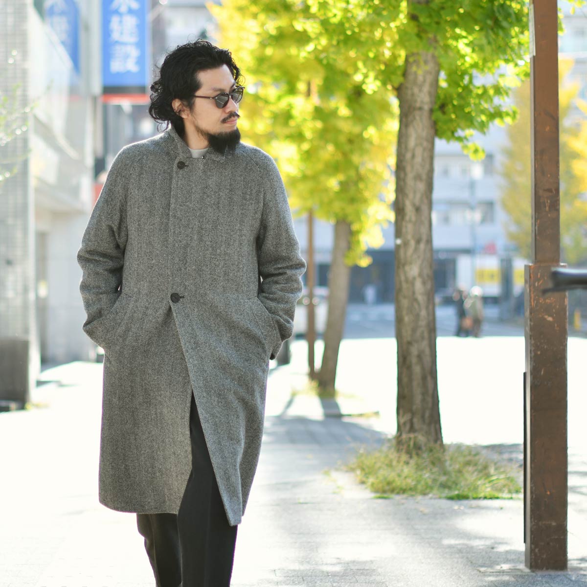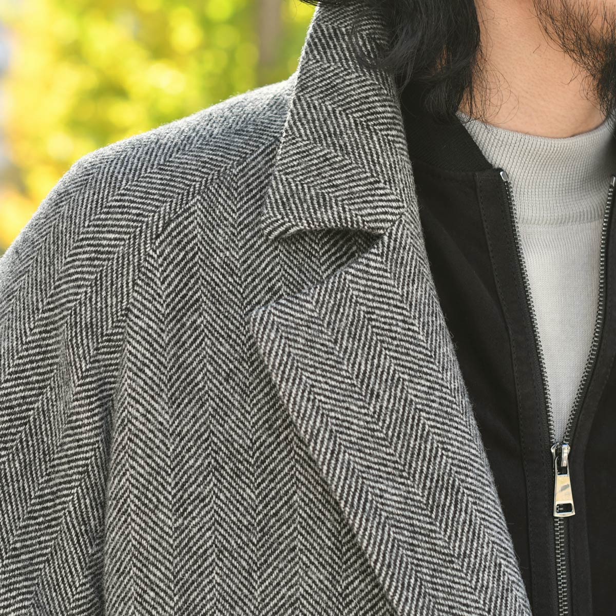 クラシカルなヘリンボーン柄で上品な雰囲気のデザインコート。