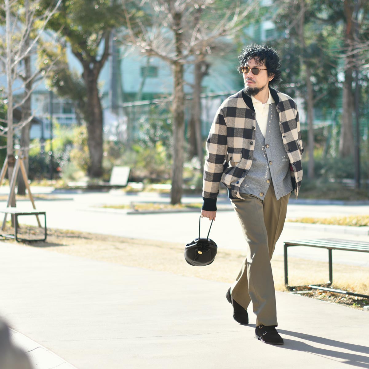 足元はブラウンのスエードシューズにバッグも同色のアイテムで統一感を。