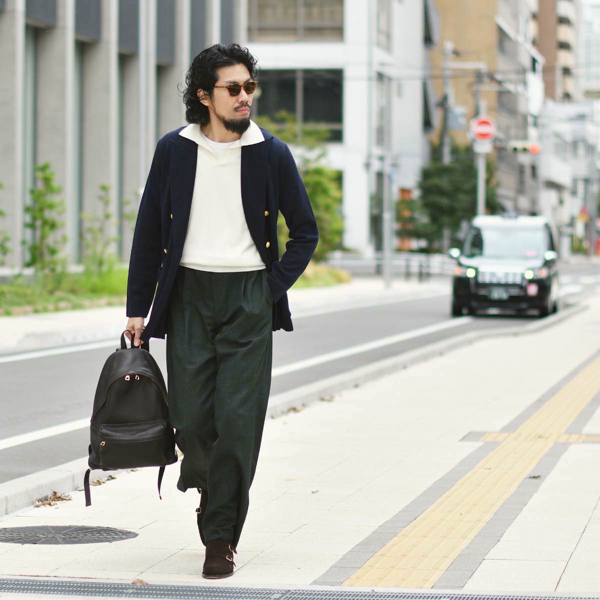 足元やバッグはブラウンでまとめたジャケパンスタイル。